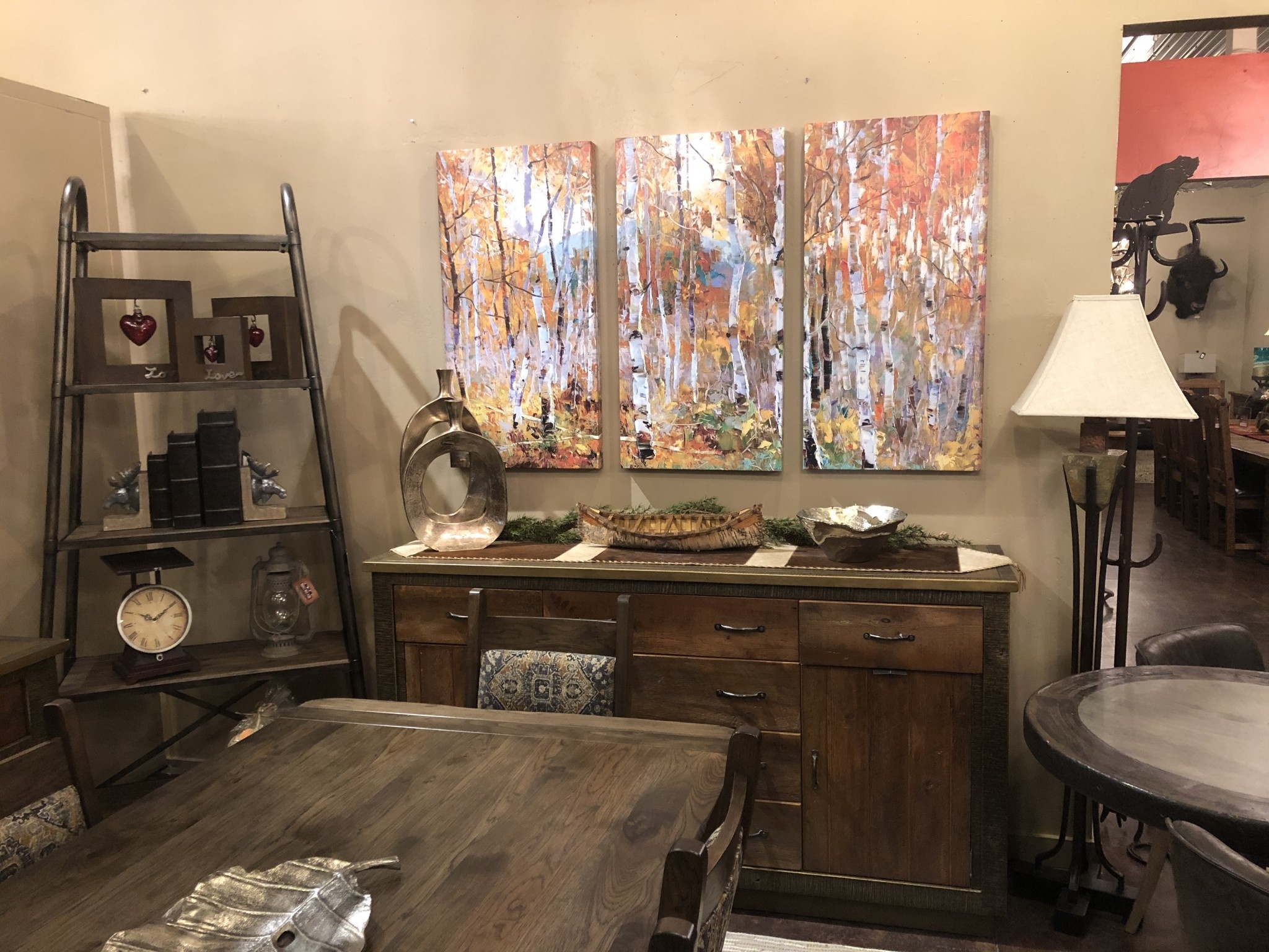 You can also find original artwork, hand sculptured bronzes, turned wood vases, antler chandeliers, lamps, scones, hooks, coat racks, dishes, rugs, and many other accessories down to hand made ornaments.